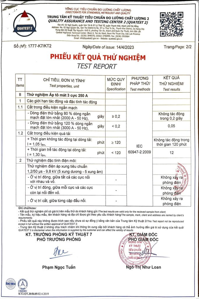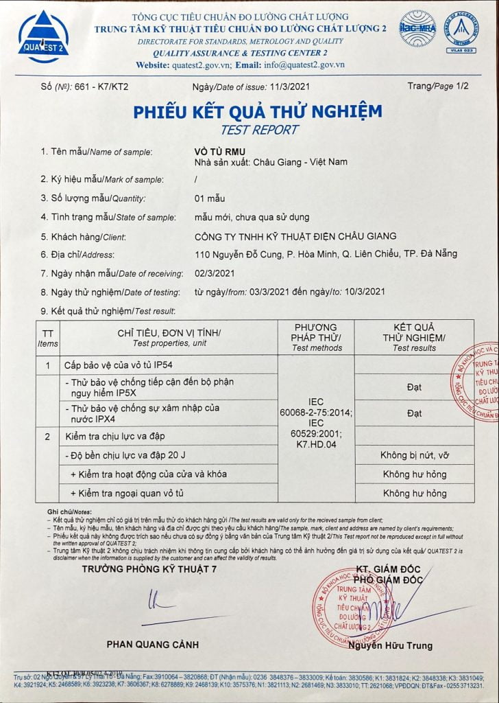 PHIẾU KẾT QUẢ THỬ NGHIỆM TỦ TỤ BÙ HẠ ÁP TRỌN BỘ